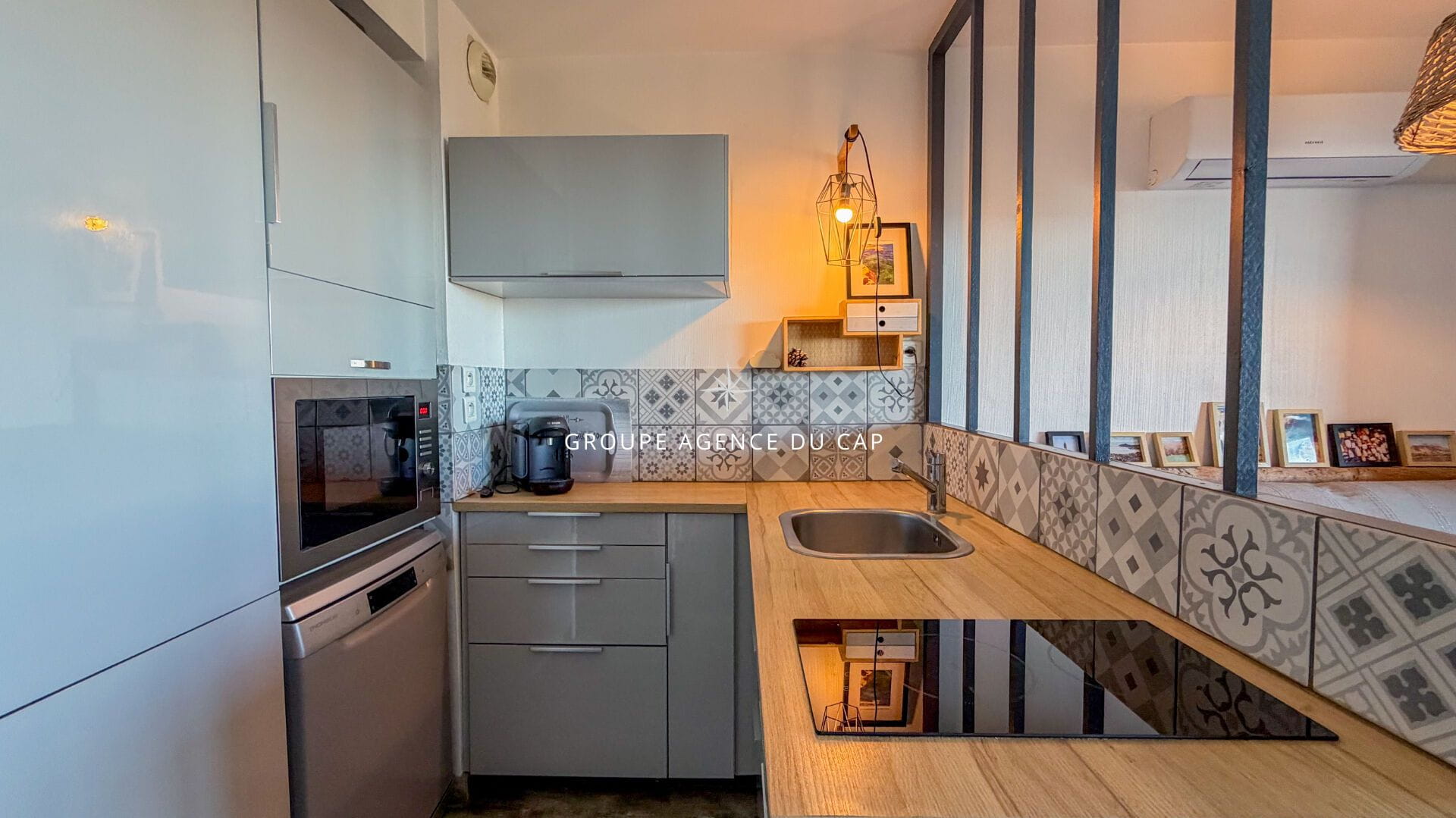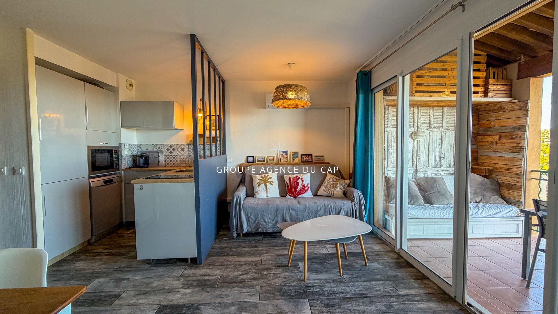 Appartement de 36 m² prolongé par une belle terrasse de 10 m², offrant une magnifique vue mer. Il se compose d’un salon-séjour avec cuisine ouverte, baigné de lumière et donnant directement sur la terrasse, idéal pour profiter pleinement de l’extérieur. L’espace nuit comprend une chambre, une cabine avec lits superposés, une salle d’eau ainsi qu’une buanderie fonctionnelle. Situé au sein d’une résidence sécurisée avec piscine, cet appartement est parfait pour une résidence secondaire ou un investissement locatif au bord de la mer.