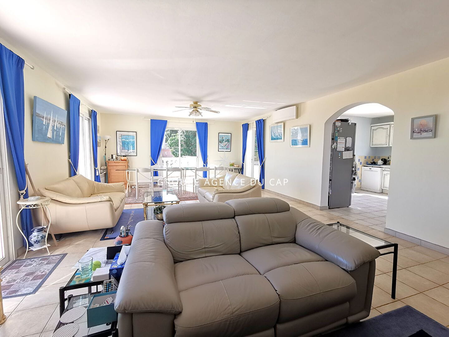 Sur les hauteurs de Saint Aygulf,, villa aux volumes généreux située au calme et bénéficiant d’une magnifique vue mer panoramique. Elle comprend 2 niveaux reliés, dont un entièrement de plain pied.