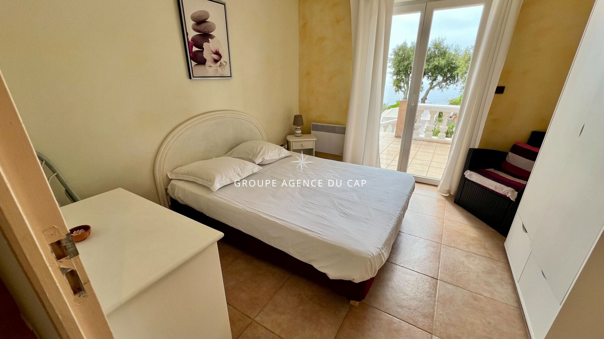 A l’étage une grande suite parentale avec terrasse privative qui offre elle aussi une vue panoramique sur la mer.