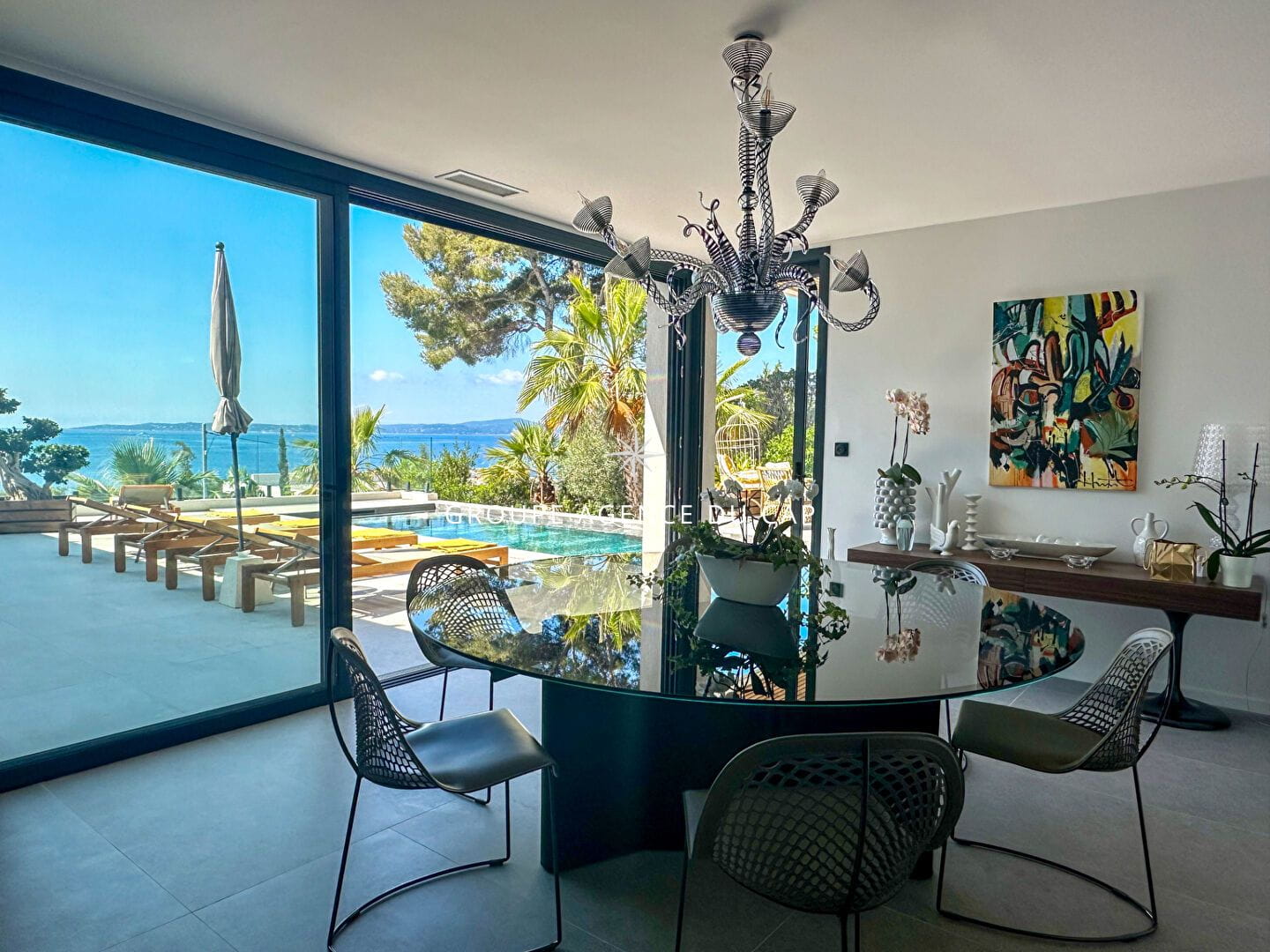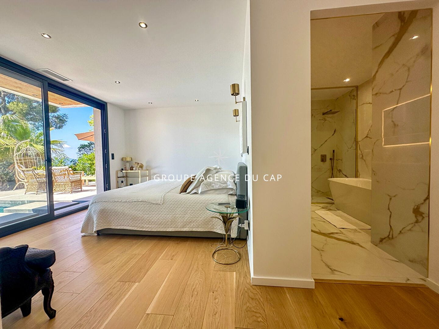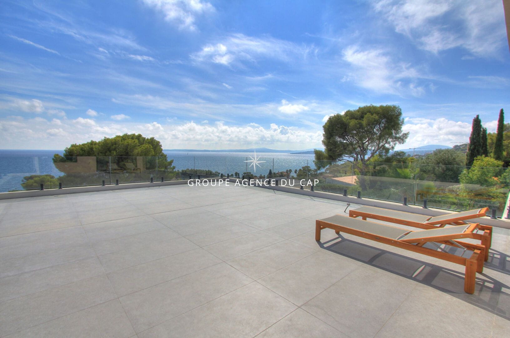 A pied de la mer et du village de SAN PEIRE, superbe villa contemporaine neuve avec VUE MER PANORAMIQUE sur la baie de SAINT-TROPEZ. Elle propose de généreux espaces de vie prolongés de terrasses face à la mer et piscine à débordement, chambre de maître, cave à vins, buanderie, cuisine design. A l’étage, on trouve 5 chambres en suite ouvertes sur 96m² de terrasse, et un bureau. Salle de sport, de cinéma, garage double, parkings 3 voitures complète cette splendide propriété. Les niveaux sont desservis par un ascenseur et toutes les pièces ont vue mer. Terrain superbement arboré, terrain de boules (évidemment !!). Une propriété d’exception qui vous permet de poser ses valises et de profiter tout simplement.