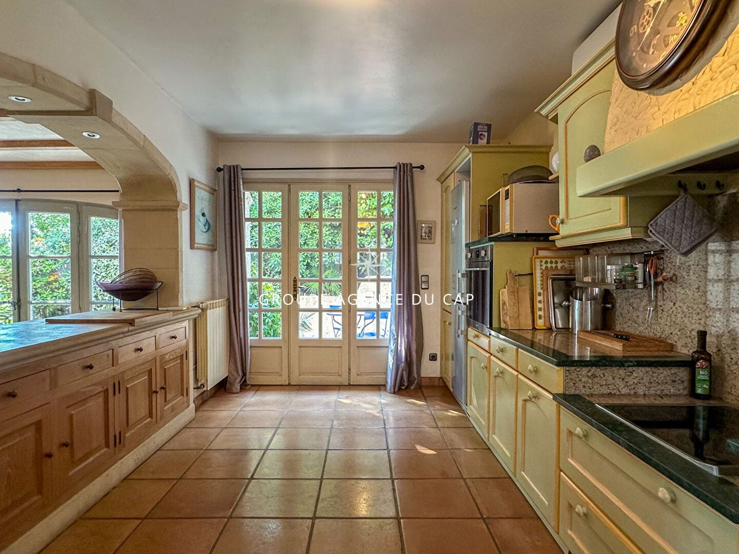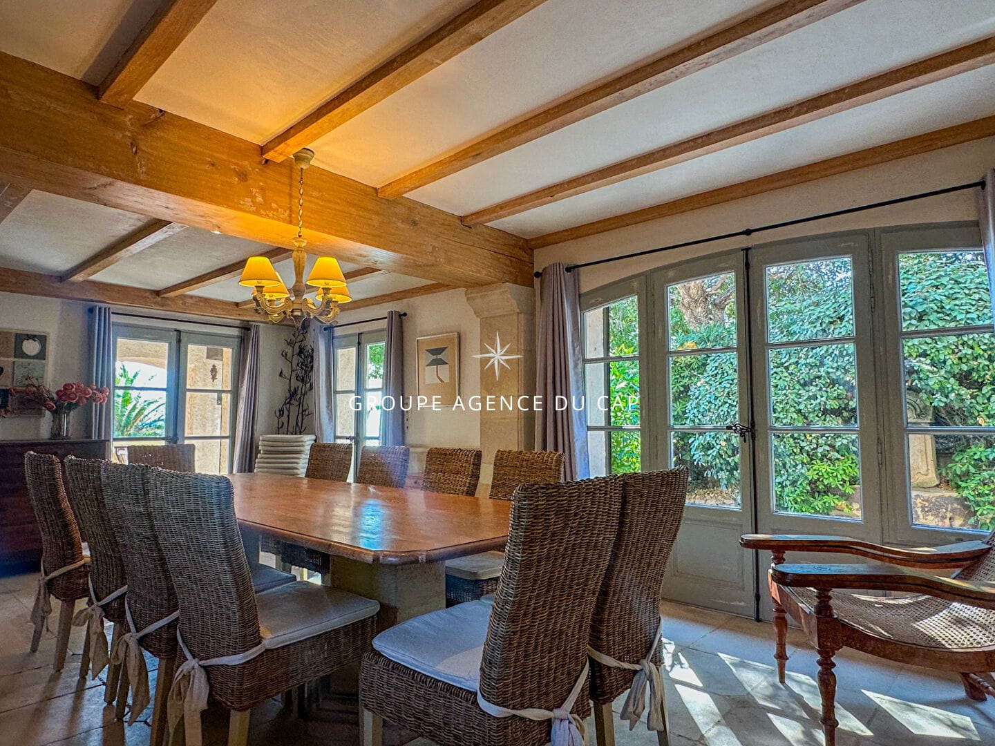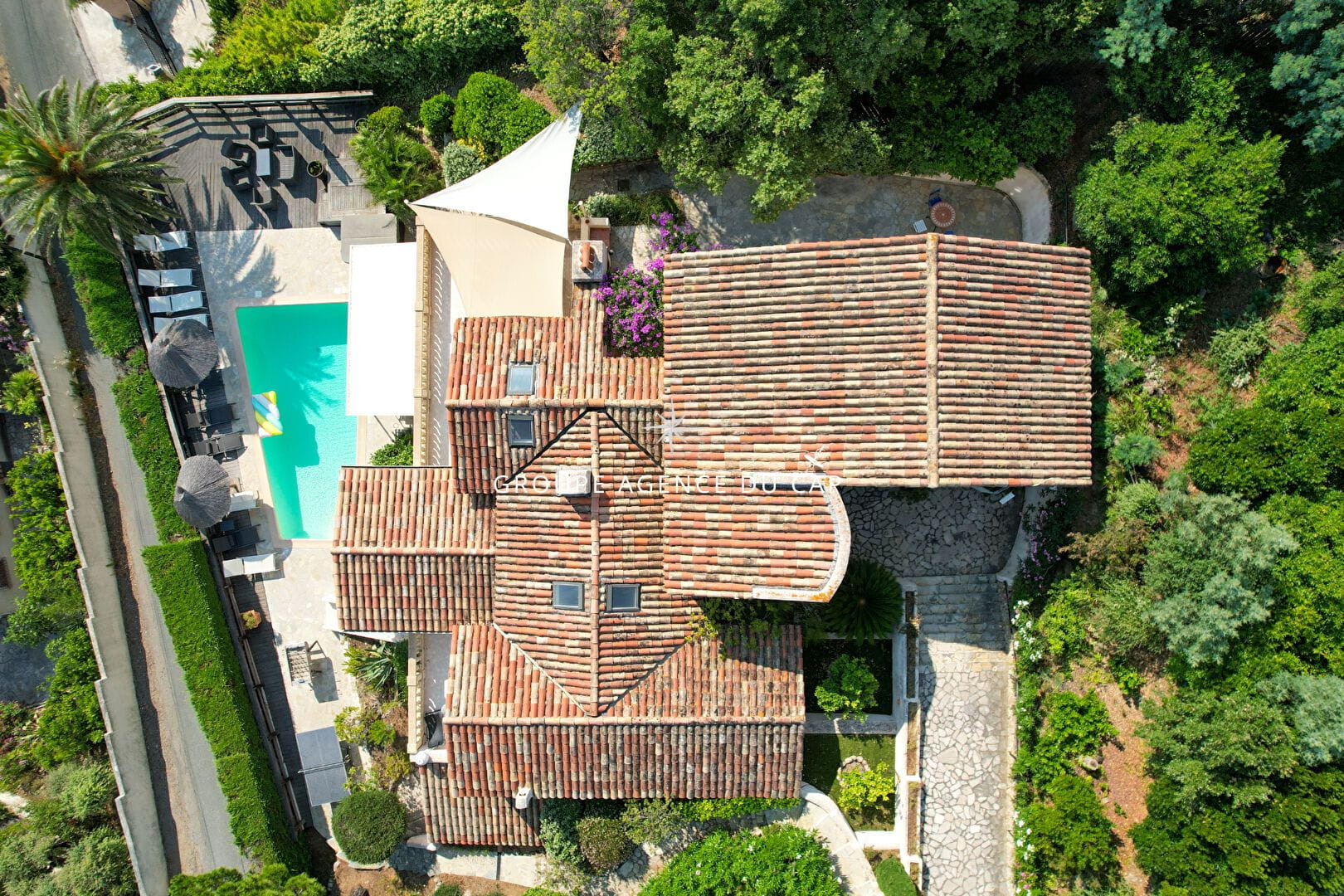 Côté jardin :Un véritable havre de paix avec une grande piscine au sel, de forme libre, une cuisine d’été entièrement aménagée, ainsi qu’une douche et des WC extérieurs pour plus de confort.
