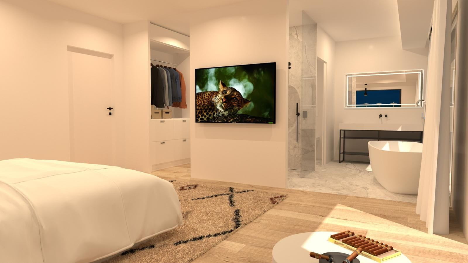 A l’étage, nous retrouverons 3 chambres en suite avec chacune leur terrasse ». La « master » bénéficie d’une salle de bain raffinée avec baignoire et douche agrémentée d’un vaste dressing.