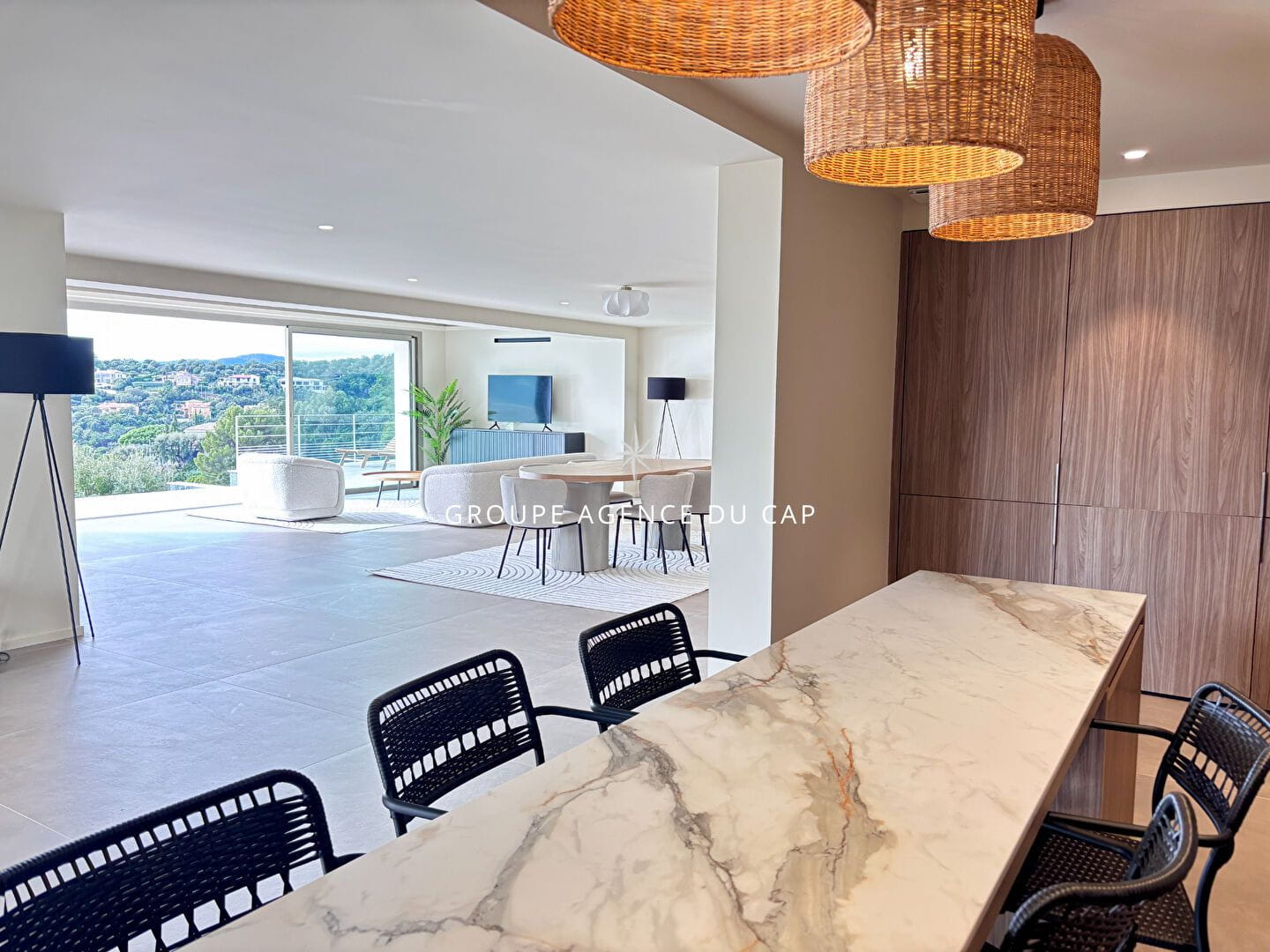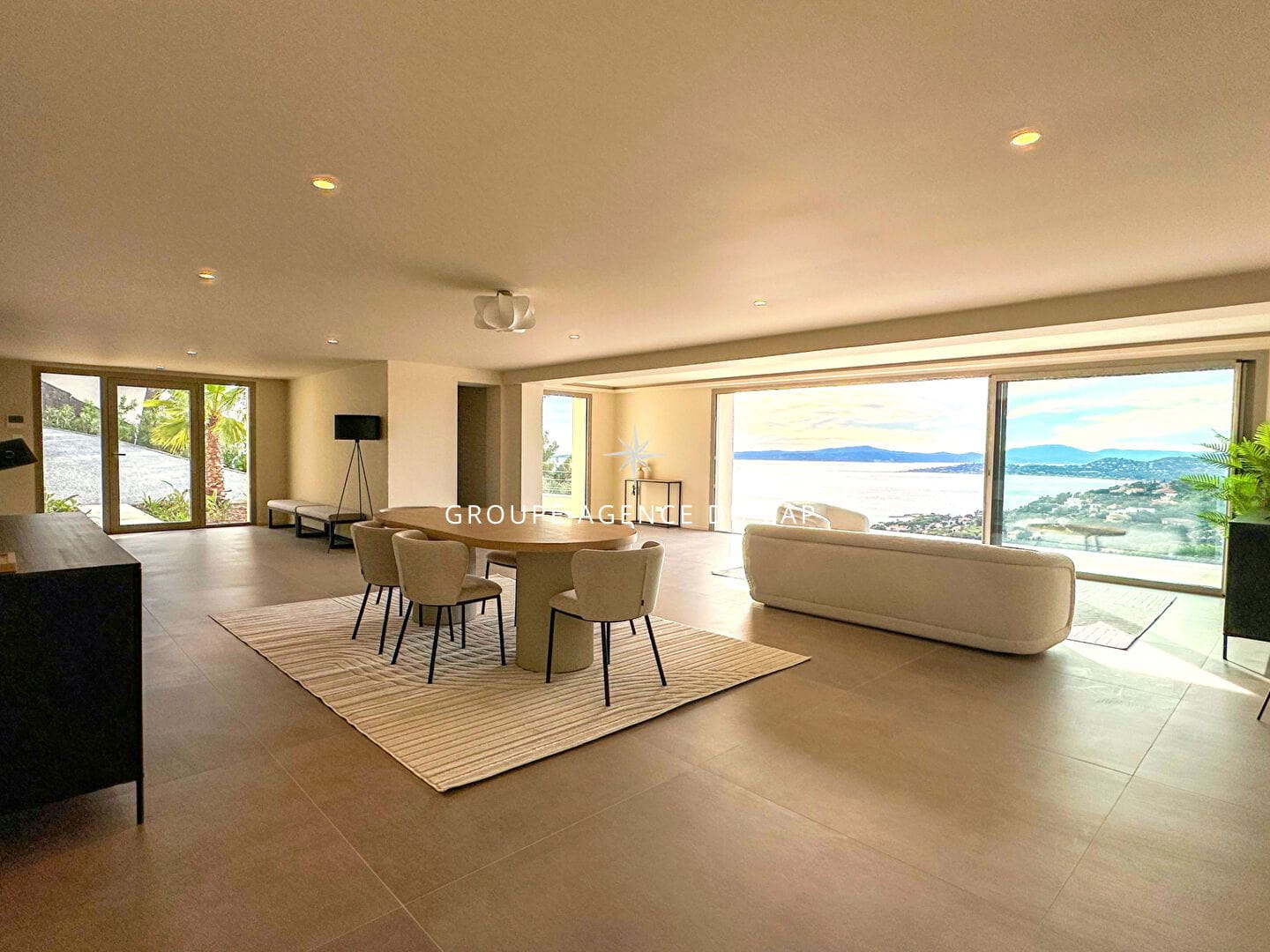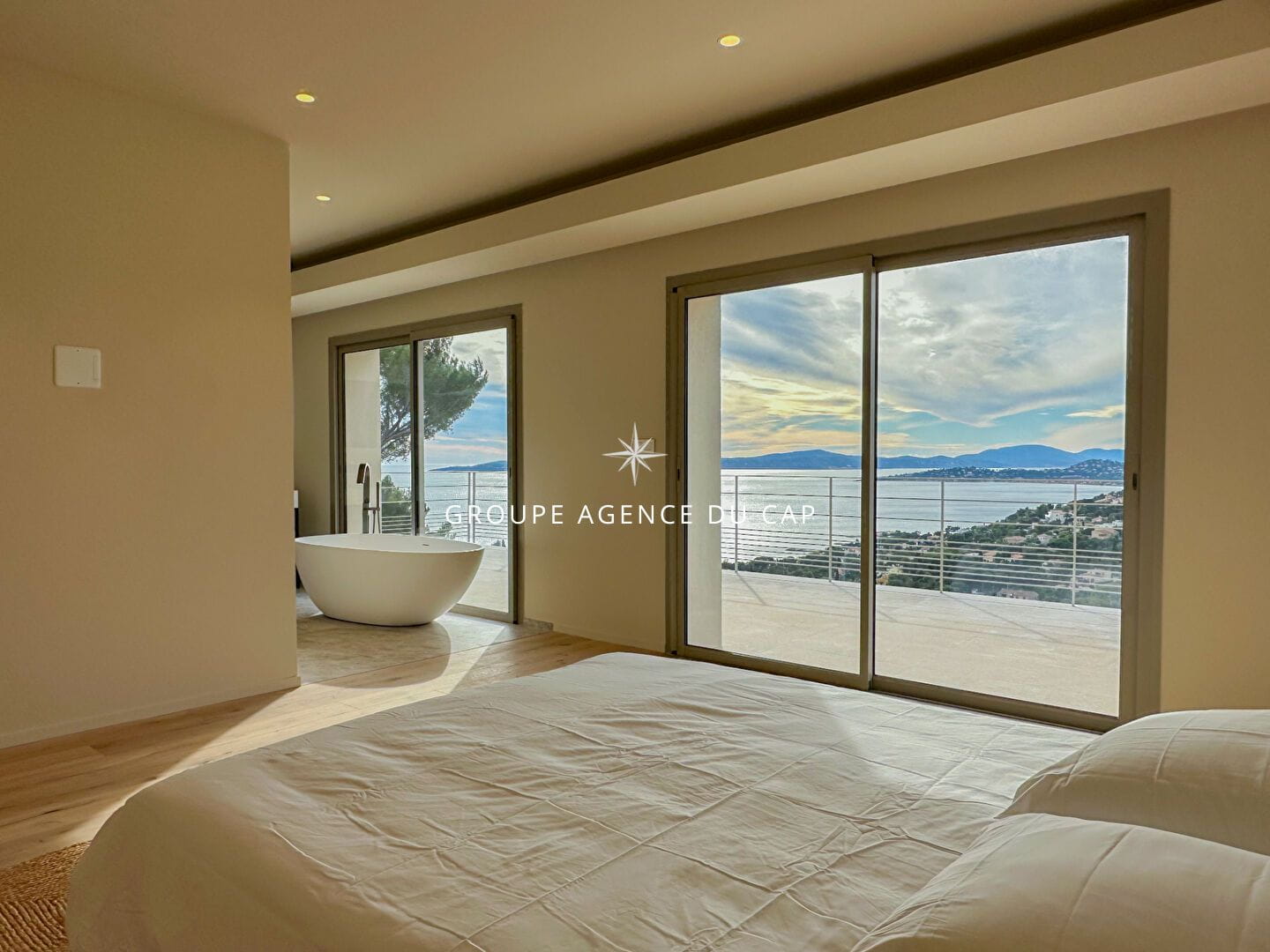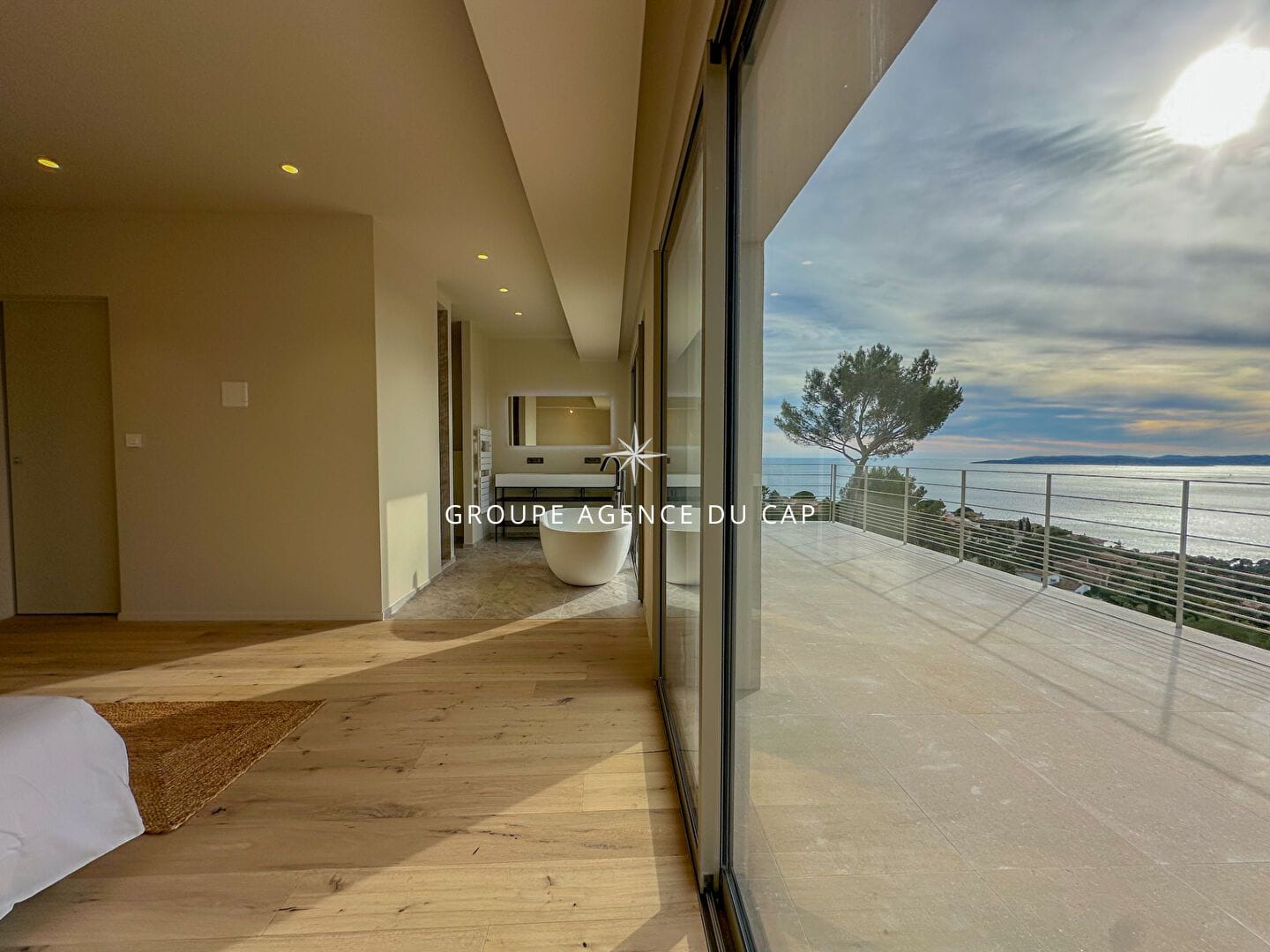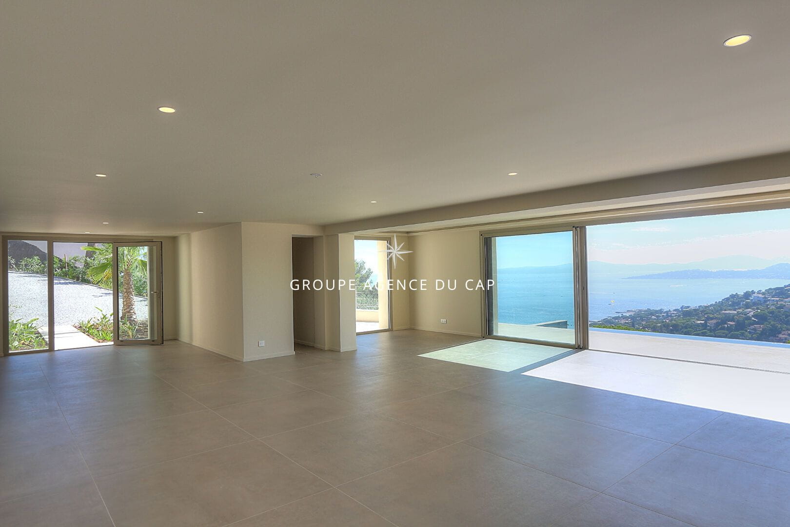 Vous apprécierez, dès l’entrée, le séjour spacieux de 100 m² exposé plein sud, offrant une vue imprenable sur la Méditerranée, une cuisine américaine et une chambre en suite de plain-pied.
